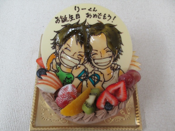 バースデーケーキに 指定イラストのルフィーとエースをプレートでトッピング 大阪市東住吉区 パティスリーデコ